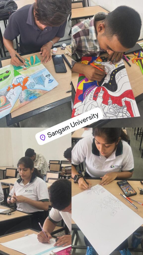 In this regard, a painting workshop was held at the Faculty of Arts and Humanities, Sangam University on 1st October 2025, in which students participated enthusiastically. The students securing first and second positions were honored with certificates of appreciation